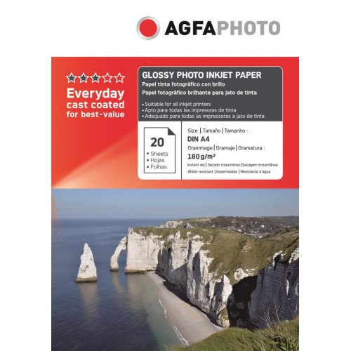 Hartie foto pentru imprimari cu jet de cerneala, marca Agfa Photo (Everyday cast coated for best-value), format A4, pachet de 20 de coli de greutate specifica 180g/mp. Produsul este Agfa original iar colile sunt ambalate in cutii de carton care ofera o protectie sporita la transport si manipulare. Hartia Agfa ofera cea mai buna suprafata pentru imprimari inkjet de inalta rezolutie, cu un grad de alb deosebit si cu o suprafata lucioasa de cea mai buna calitate. Hartia Agfa Photo originala are marcat pe spatele fiecarei coli logoul ca dovada a autenticitatii si garantie a calitatii.
