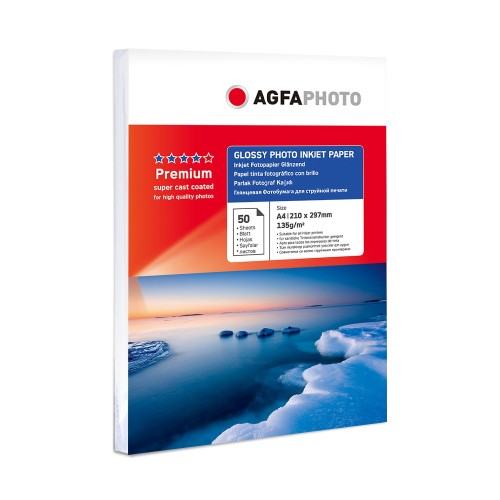 Hartie foto lucioasa, subtire, pentru imprimari cu jet de cerneala, marca Agfa Photo (Everyday cast coated for best-value), format A4, pachet de 50 de coli de greutate specifica 135g/mp. Produsul este Agfa Photo original iar colile sunt ambalate in plicuri transparente din plastic (polybag). Hartia Agfa ofera cea mai buna suprafata pentru imprimari inkjet de inalta rezolutie, cu un grad de alb deosebit si cu o suprafata lucioasa de cea mai buna calitate.