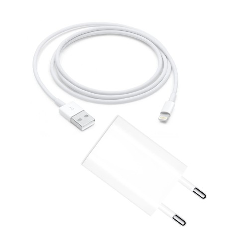 Alimentator incarcator pentru iPhone 5,6,7,8,X,XR,XS,11,SE,12, 13 (C/S/SE/PRO/PLUS/MAX), iPad, compatibil lightning, normal charge, USB, 5W, alb, cu cablu compatibil lightning inclus pentru incarcare si transfer date telefon si tableta Apple