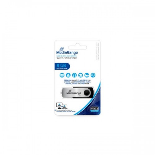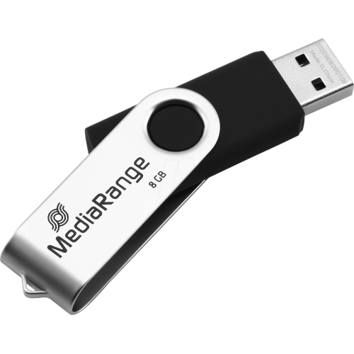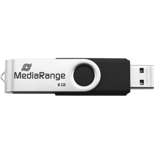 Memorie flash USB de capacitate 8GB, marca MediaRange, model MR908. Memoriile flash USB se mai numesc stick-uri USB sau pen drive sau flash drive. Modelul memoriei USB Media Range de capacitate 8 GB este realizat dintr-o carcasa de plastic negra, in jurul careia pivoteaza o alta carcasa metalica, argintie, care are rolul de a proteja conectorul de legatura USB