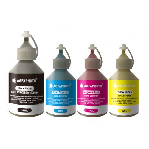Set de 4 culori cerneala compatibila Brother sticluta 100ml black (negru) + 3 sticlute x 50ml cyan magenta yellow (albastru rosu galben), marca Agfa Photo