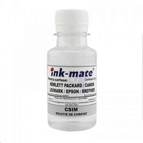 Ink-Mate este imbuteliata in recipiente / flacoane / sticlute de capacitate 100 ml. Fiecare flacon de 100ml de solutie speciala de curatare cap de printare este sigilat ermetic.